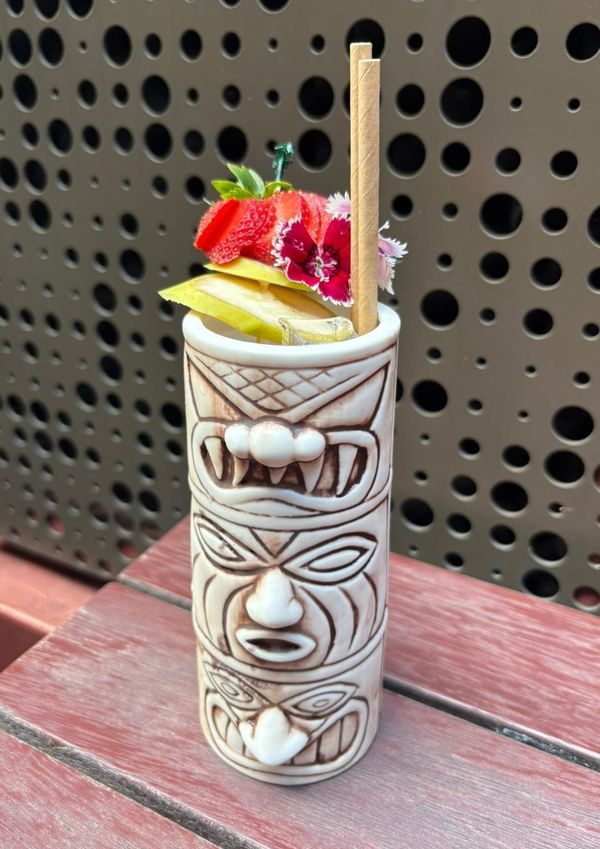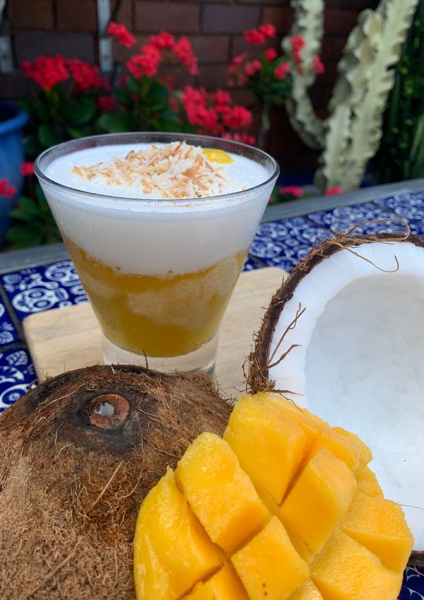 Frozen Mango & Beach Spice Rum, Macadamia & Lime, topped with White Chocolate Salt Coconut & toasted Coconut